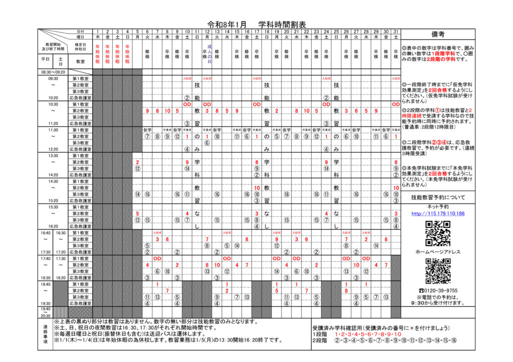 教習予約 ①予約サイトへ移動します 技能教習の予約や変更、予約状況の確認をインターネットで行うことが出来ます。下のボタンをクリックすると予約サイトに移動します。そちらから予約をお願いします。 ②教習生番号とパスワードを入力 【教習生番号】を半角大文字で入力して下さい。 【パスワード】:入校申込書に記入した6桁の数字を入力して下さい。 ③ログイン 「ログイン」ボタンをクリックしてログインしてください。ログイン後、画面の案内に従って予約をお取り下さい。